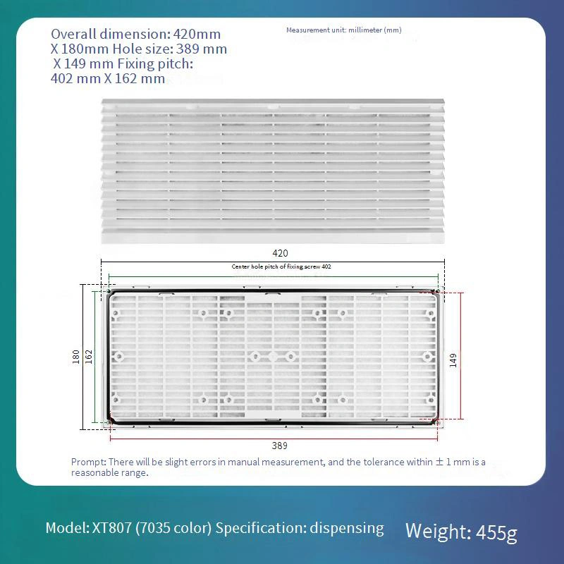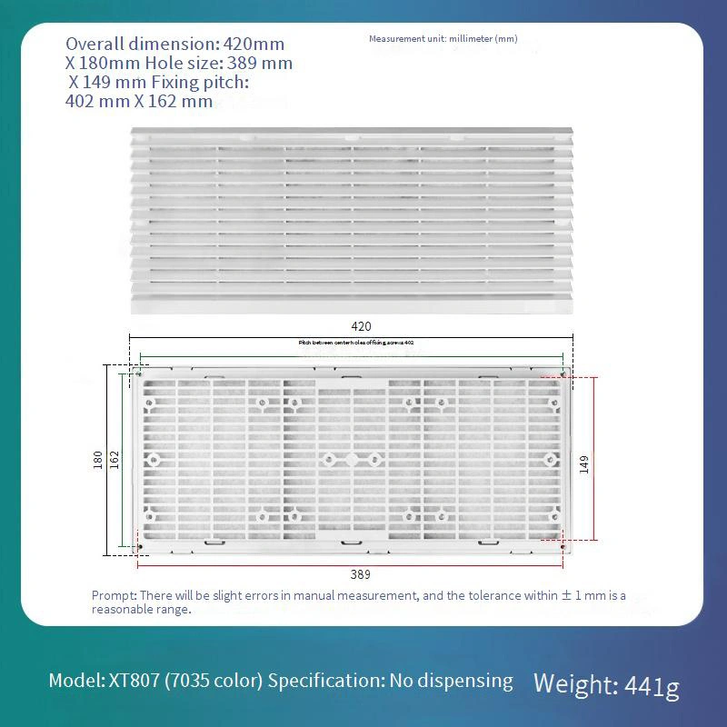 Имеет сменную сетчатую фильтрующую конструкцию, упрощающую ежедневное обслуживание и замену, что значительно снижает долгосрочные эксплуатационные расходы. Каркасная конструкция доступна в стандартном бело-сером цвете 7035. Он изготовлен из материала ABS, который обеспечивает превосходную устойчивость к деформации и обеспечивает долговременную стабильность.